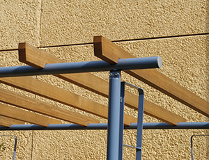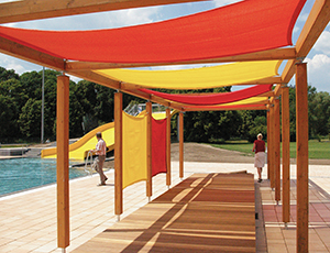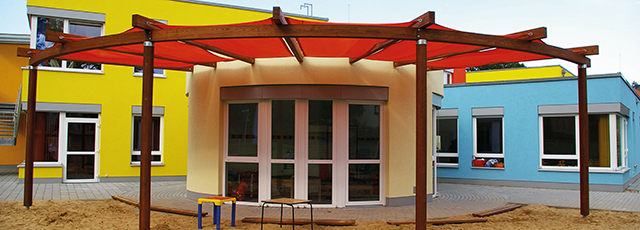Pergolen schaffen luftige, dennoch geschützte Aufenthaltsorte im Freien und wirken raumbildend. Je nach Nutzung und Situation sowie gewünschter Formensprache kann eine Pergola in unterschiedlichen Varianten und aus verschiedenen Materialien hergestellt werden. Neben Holzkonstruktionen werden auch Stahl-Holzkonstruktionen mit geraden oder gebogenen Pfetten projektbezogen angefertigt. Bei Planungen von Einrichtungen für Kinder und Senioren wird besonderer Wert auf die Möglichkeit zur Beschattung gelegt. So kann durch ein Schatten spendendes Textil an heißen Tagen ein angenehmer Aufenthalt im Freien angeboten werden. Dies kann unter anderem durch eine Kombination aus Pergola und Sonnensegel erreicht werden. Unsere Sonnensegel werden passgenau nach Maß angefertigt und sind in verschiedenen Ausführungen und Systemen erhältlich.